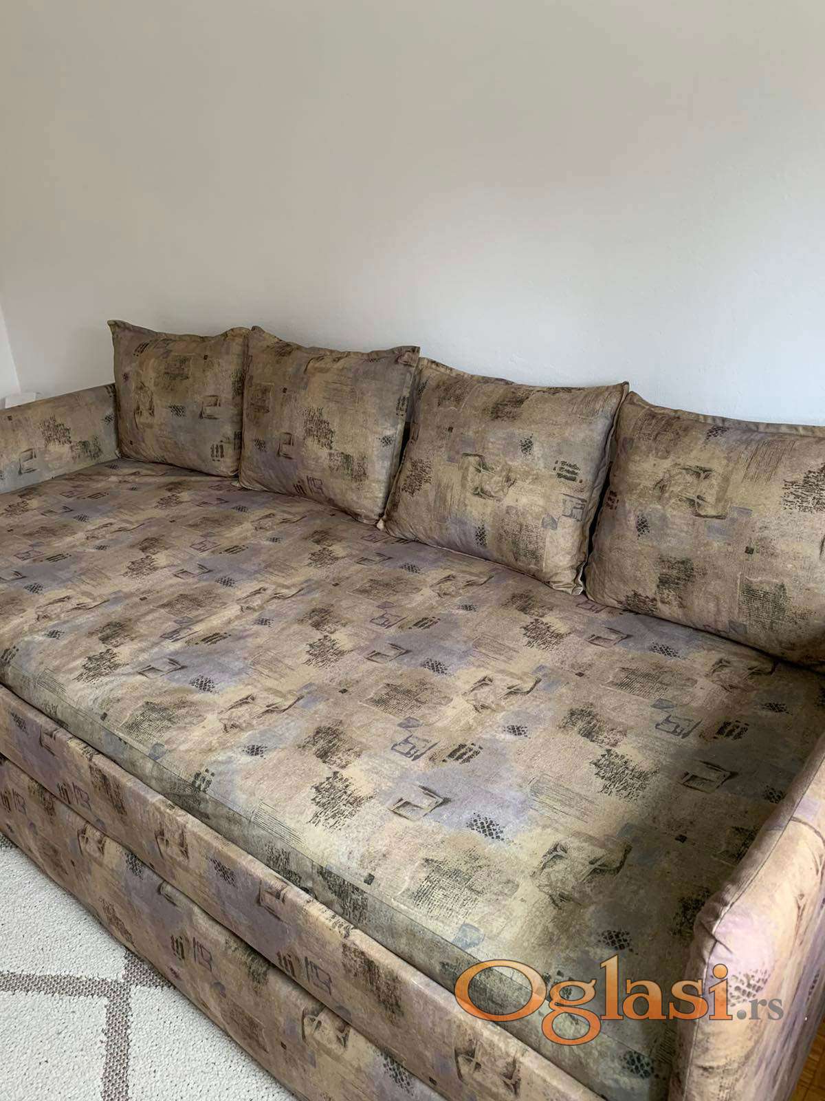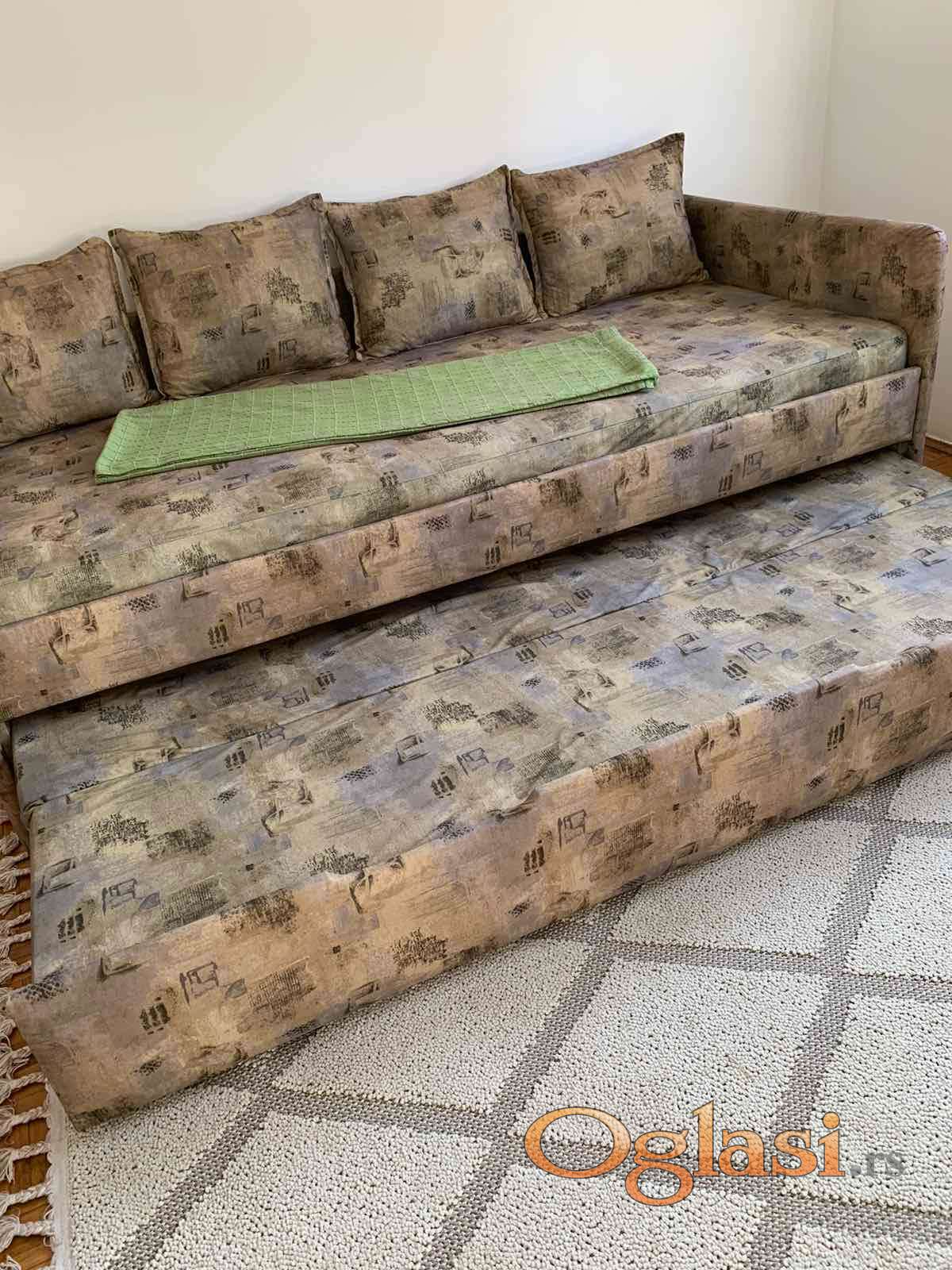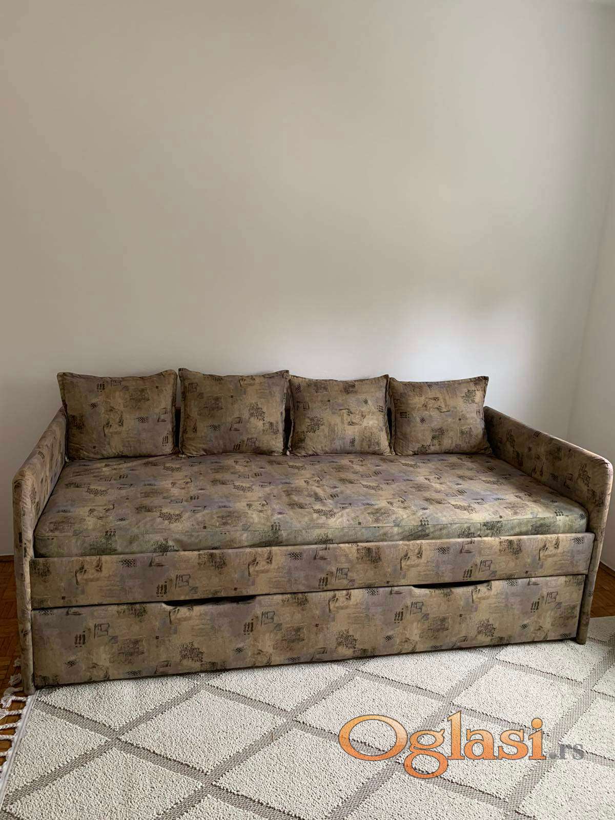 Prodaje se korišćen ležaj u ispravnom stanju, može se koristiti i za sedenje, ima 4 jastuka, a ima i pomoćni ležaj u vidu fioke koja se izvlači do širine od 75 cm. Dimenzije ležaja su 198x93cm.