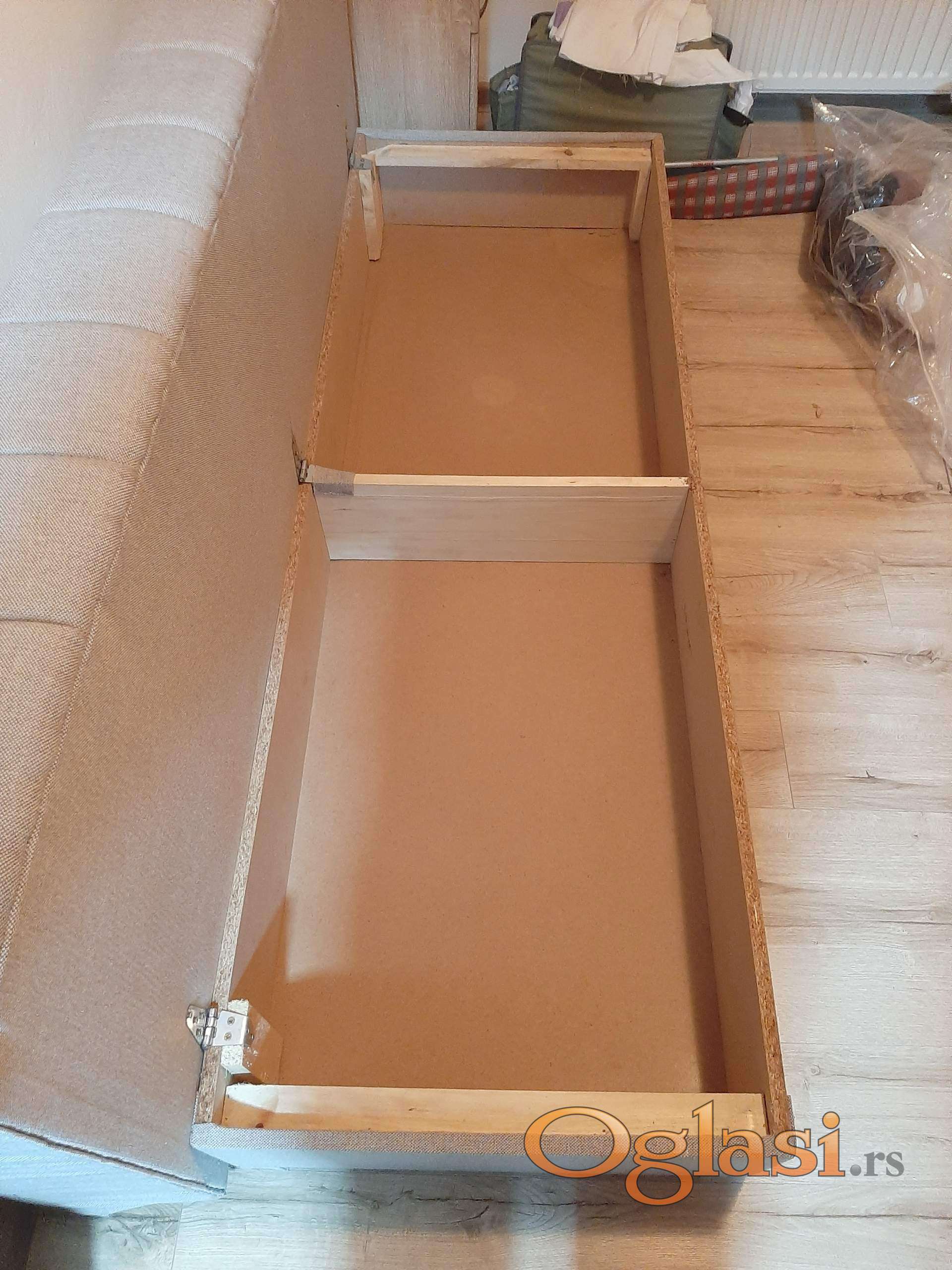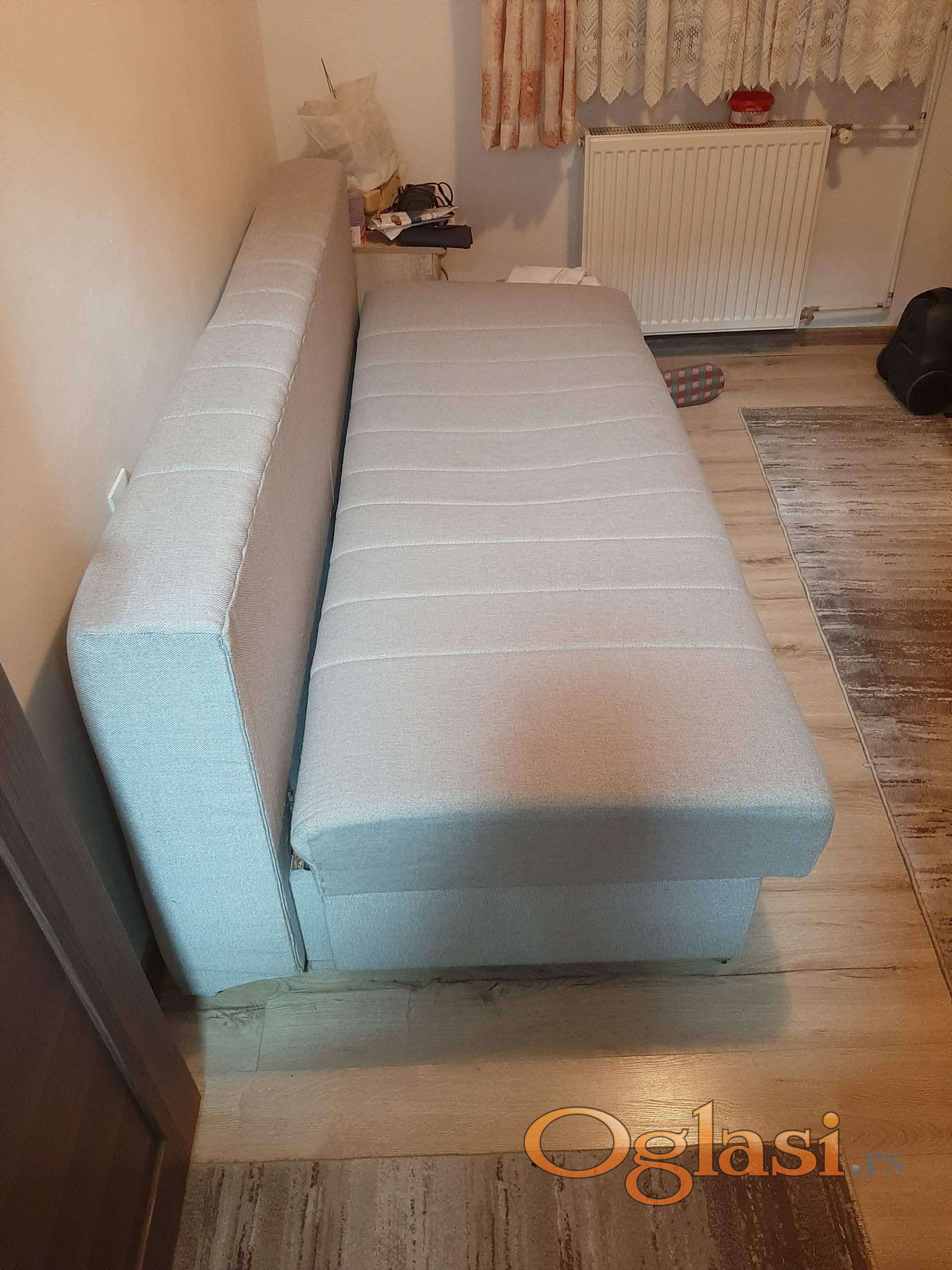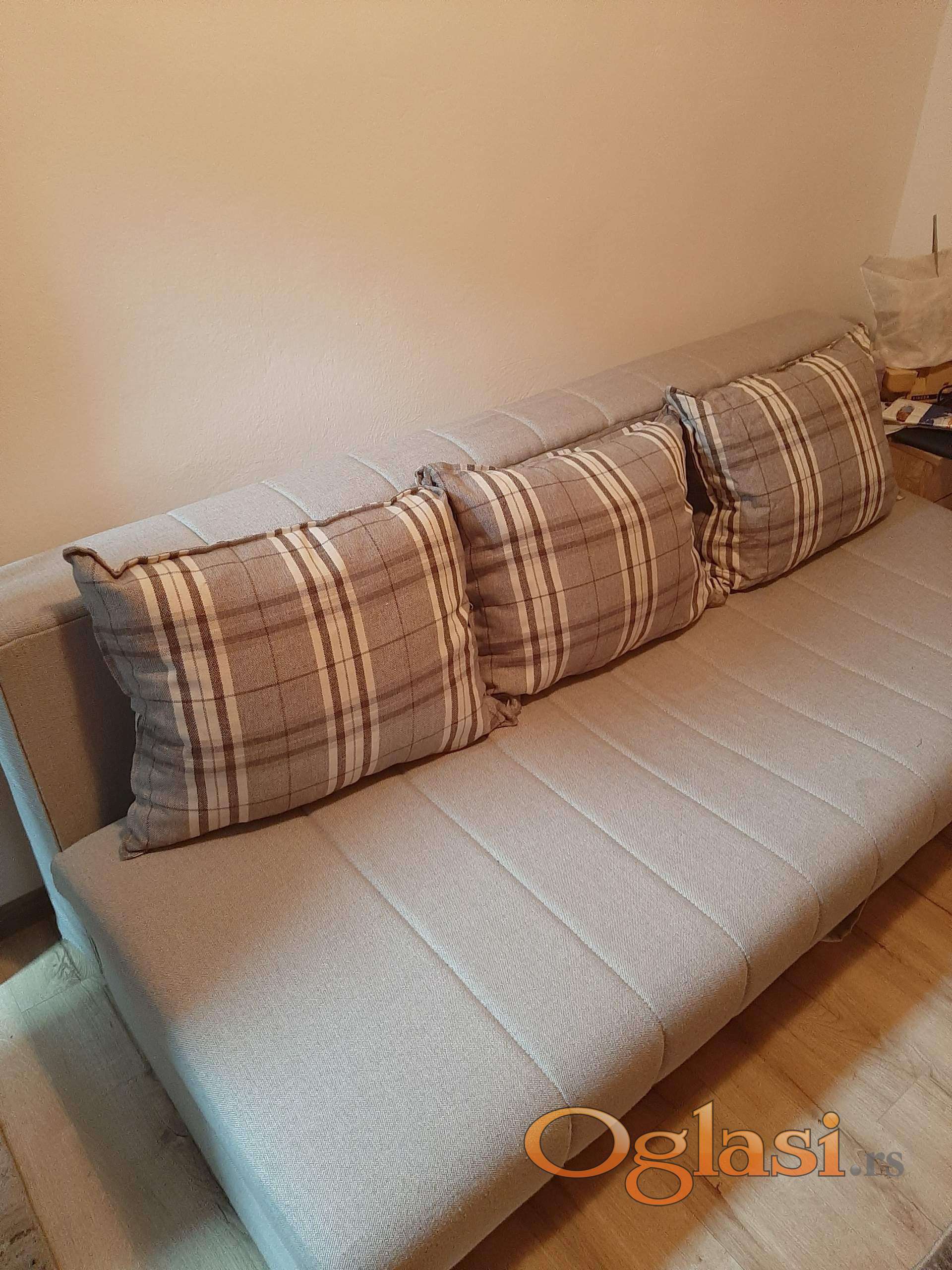 Prodajem polovan, dobro očuvan trosed na razvlačenje. Dužina troseda je 195cm a širina je 150cm (kad se razvuče) i mogu komotno 2 odrasle osobe da spavaju na njemu. Uz trosed dolaze i 3 jastuka.