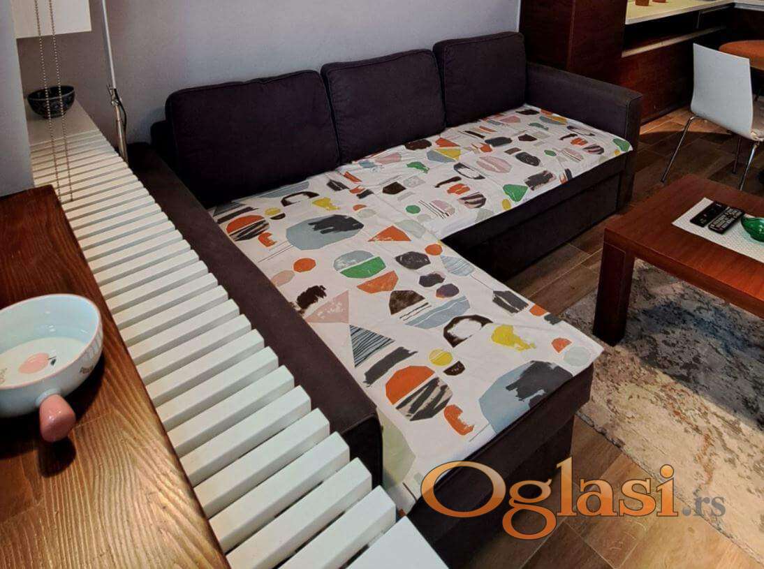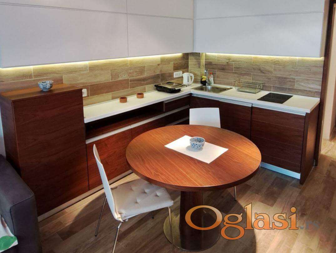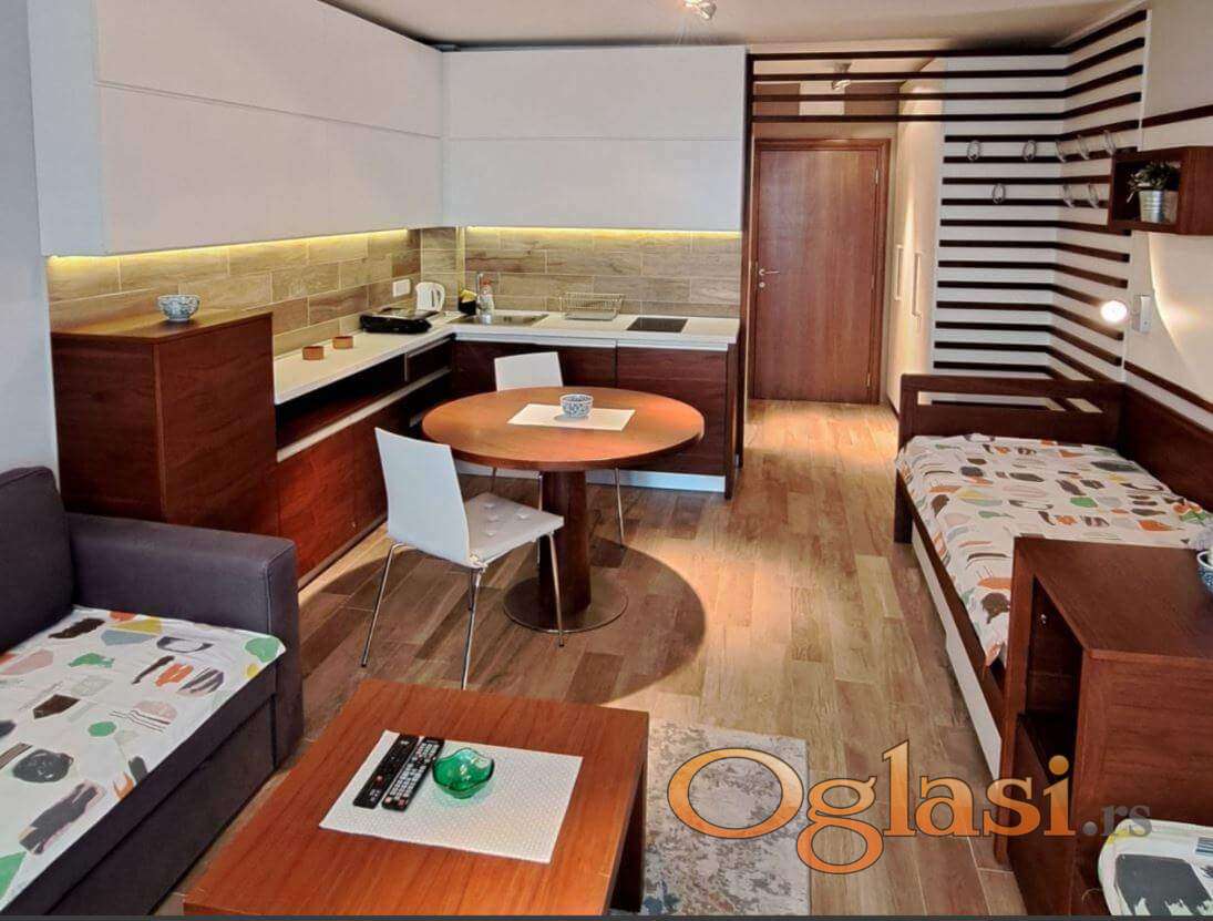 Centralni deo apartmana čini prostran dnevni boravak sa trpezarijskim delom, potpuno opremljenom kuhinjom, udobnom ugaonom garniturom i dva single ležaja. Ukupan spavaći kapacitet je 4 osobe.