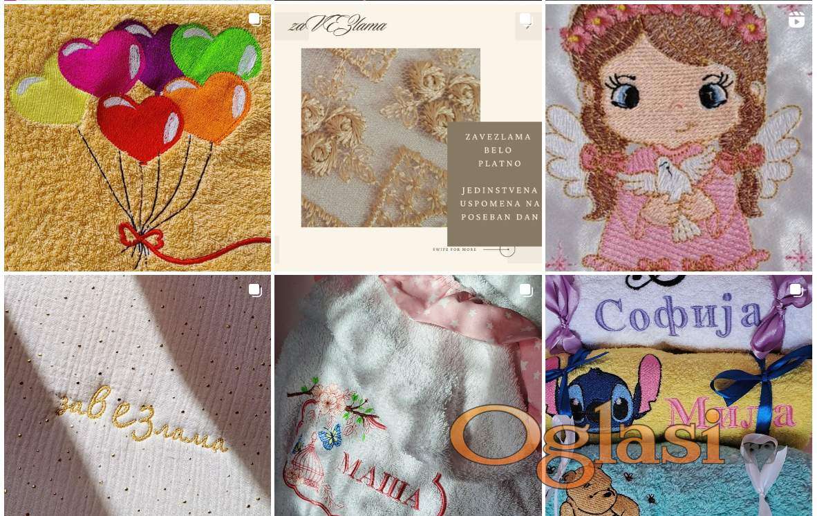 Bavimo se mašinskim vezom na raznim materijalima, a najčešće se poručuju: peškiri za decu i odrasle, posteljine, jastuci, kačketi za decu i odrasle, kecelje, kravate, torbe, rančevi, bela platna / saten za krštenje i venčanje, bela platna / saten za devera, majice, duksevi, košulje, okrugli drveni ramovi, daire, praznične čarape i mnogi drugi materijali na kojima želite da ostavite personalizovanu poruku za Vašu dragu osobu.
