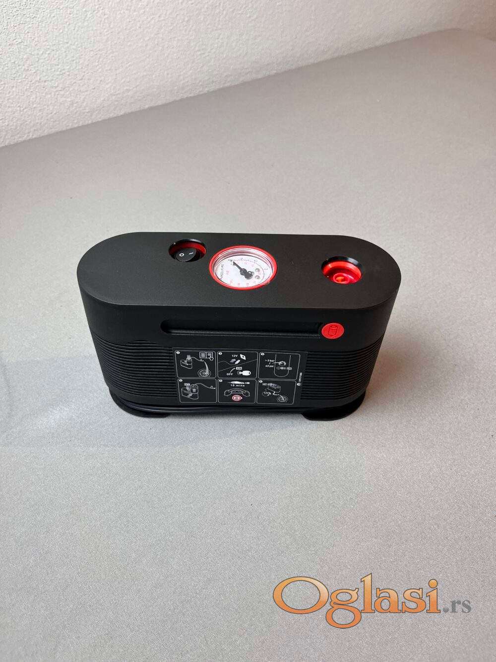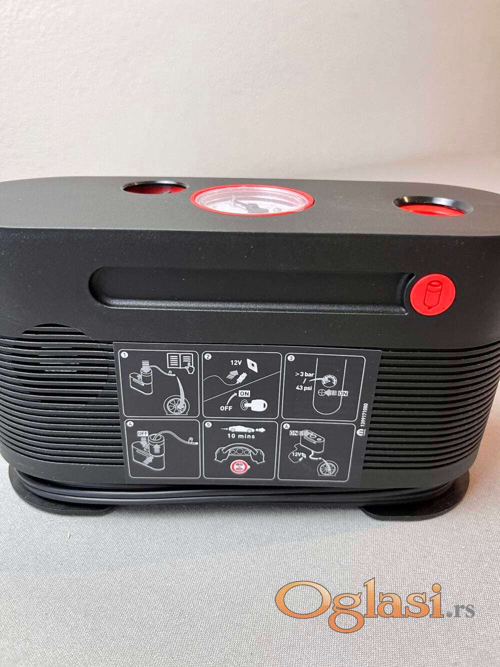 Uz kompresor dobijate kanister sa tečnošću, torbu za nošenje i uputstvo za upotrebu.