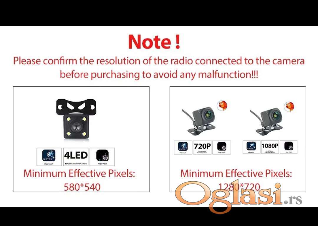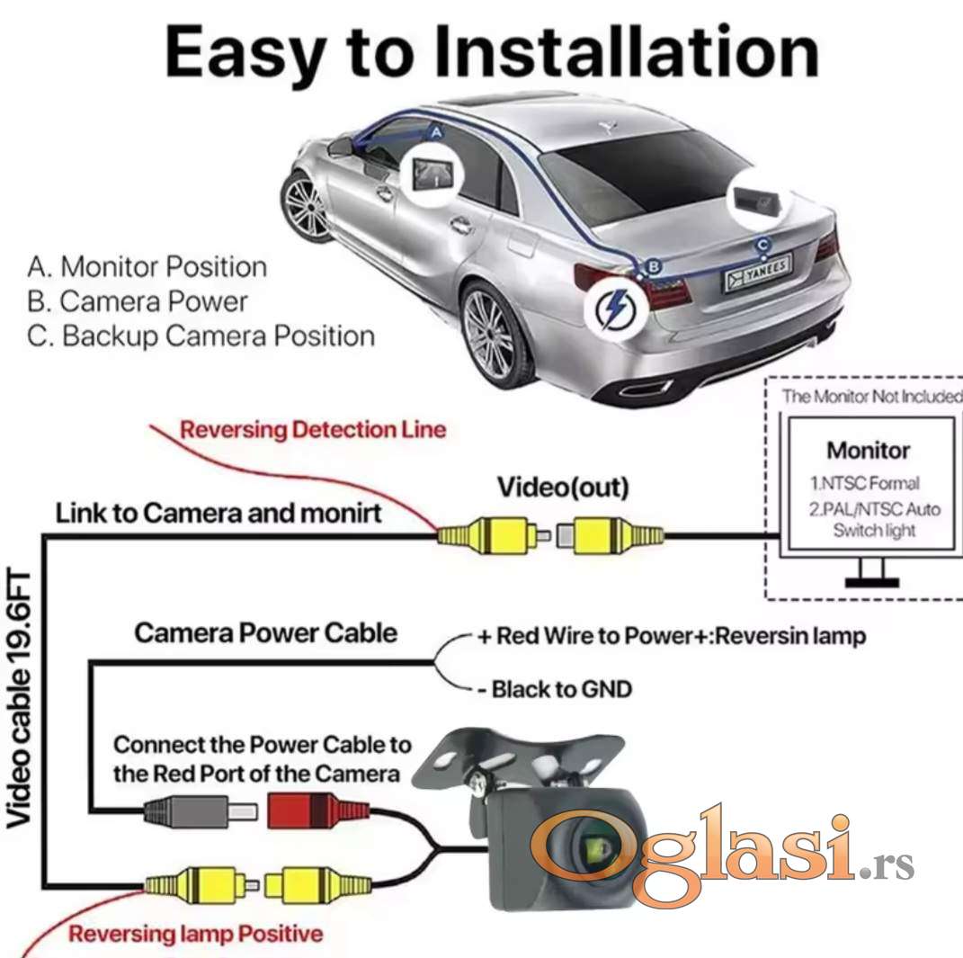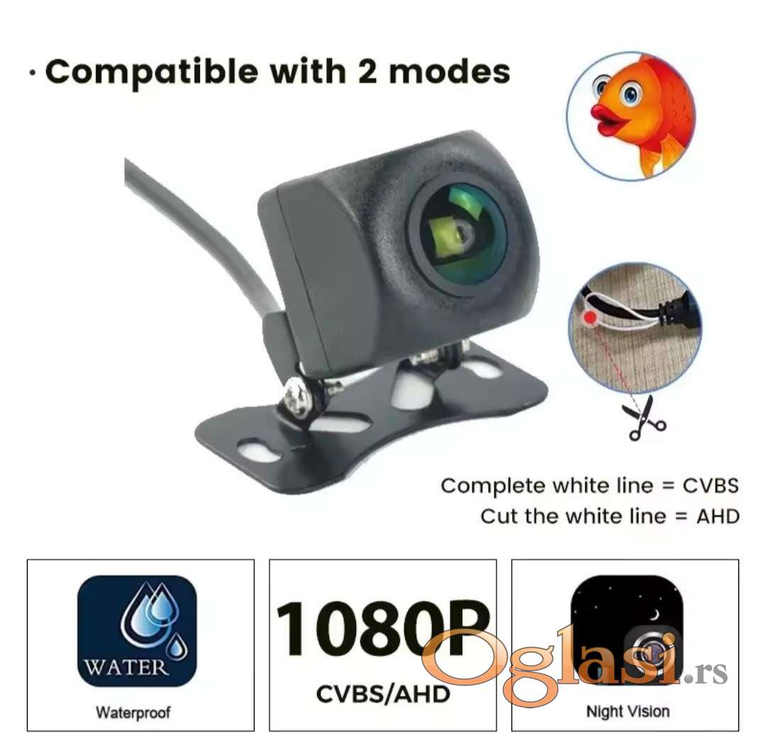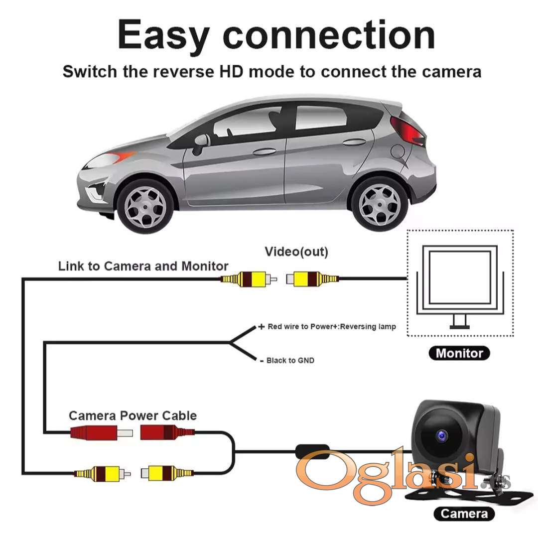 720x480 do 1280×720 piksela , kamera pruža jasan i širok prikaz prostora iza vozila, čak i u uslovima slabije osvetljenosti. Podržava NTSC video sistem visokih performansi i povezuje se putem standardnog RCA video izlaza , što omogućava jednostavnu integraciju sa većinom multimedijalnih uređaja. Zahvaljujući kućištu izrađenom od ABS + PC materijala i IP67 zaštiti, kamera je otporna na vlagu, kišu i prašinu, što je čini pogodnom za sve vremenske uslove. Napaja se putem DC 12V napajanja.